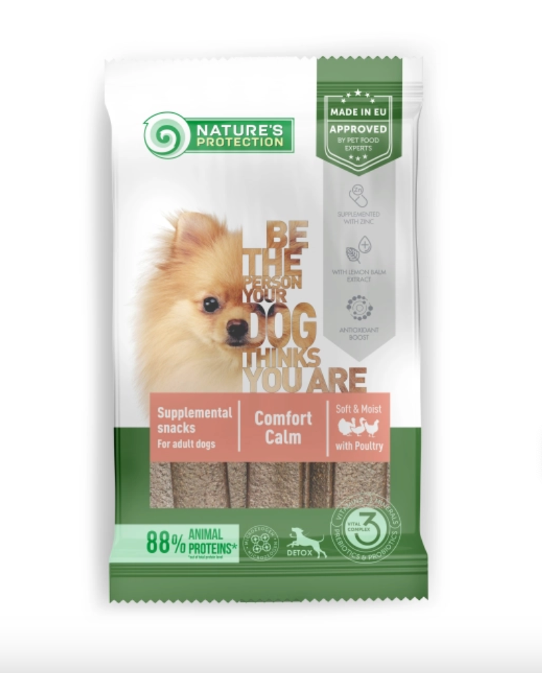 Nature’s Protection Comfort Calm supplemental snacks are the highest quality feed supplement designed for adult dogs of all breeds. It is a perfect choice to show love for your dog and at the same time provide the daily dose of essential vitamins, minerals, prebiotics, and probiotics. The protein source is the 1st ingredient in the composition. These functional snacks – supplements have a wetter and softer texture than the usual treats.