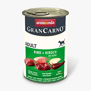 Wet food made from fresh meat ingredients that provides unparalleled enjoyment for dogs. This diet is formulated to meet the nutritional needs of pets aged 1 to 6 years. GranCarno Adult Beef + Venison with Apple ensures your pet receives all essential nutrients they need daily. It combines apples with hearty and delicious ingredients such as beef and venison. Produced in Germany, GranCarno Adult Beef + Venison with Apple is grain-free and does not contain soy or sugar.