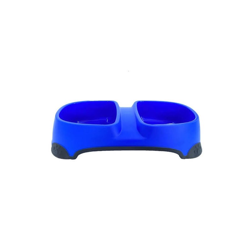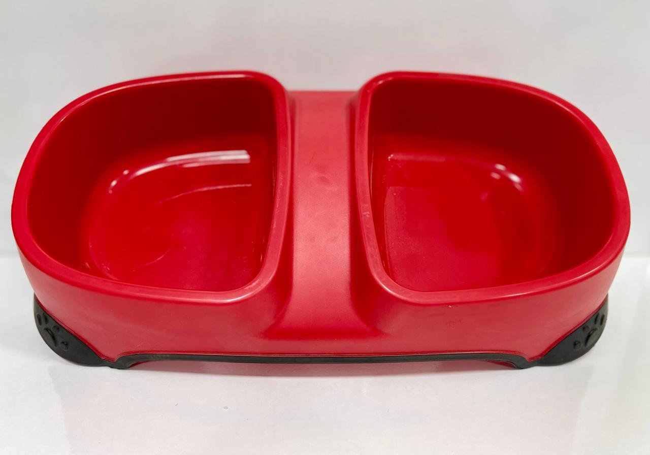It’s a dish made of durable plastic, featuring 2 bowls for food and water, and a non-slip rubber base.