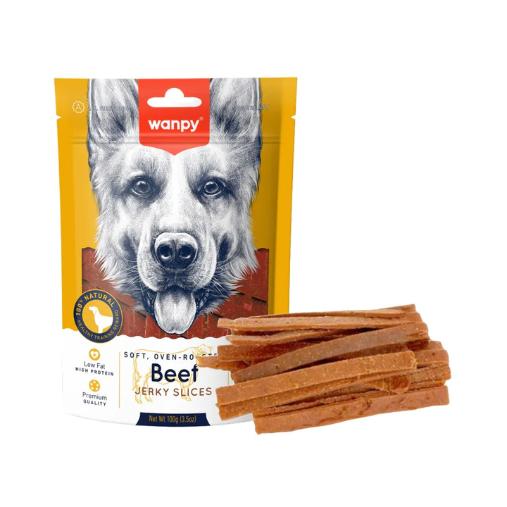 Натуральное лакомство для собак Wanpy Soft Beef Jerky Slices – вкусные кусочки из вяленого мяса говядины и утки, мясные деликатесы высшего качества без сахара и искусственных ароматизаторов с небольшим содержанием соли в качестве натурального консерванта. Эти лакомства подходят для собак всех пород, которые уже исполнялись 3 месяца.