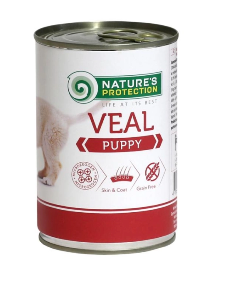 Nature’s Protection is a Super Premium canned pet food for all breeds Puppies with Veal, served in a delicious broth and supplemented with minerals. The main source of protein is quality veal. This food is soft and easy to chew, composition of meat and broth are highly digestible. The food is balanced for young dogs up to 12 months of age. Nature‘s Protection canned pet food is designed to meet the different needs of young and adult dogs. The main source of protein in this pet food is the meat of high nutritional value.