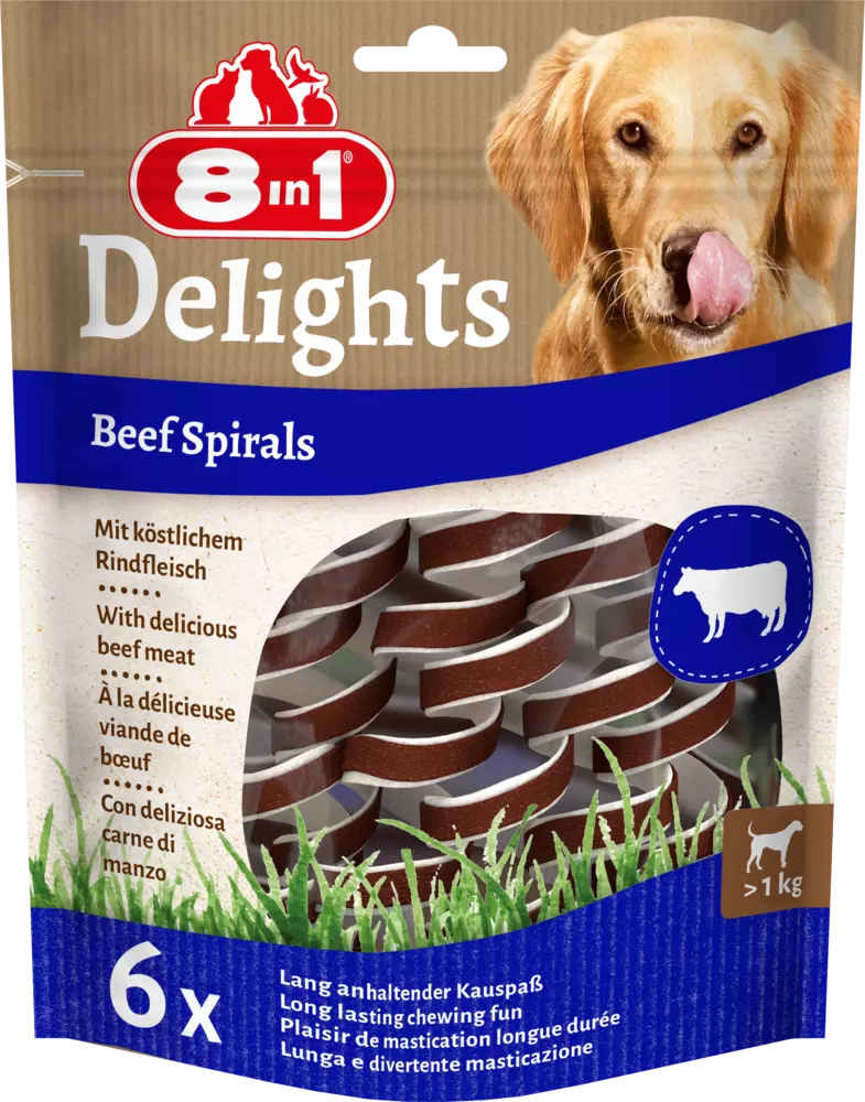 Спирали из говядины 8in1 Delights изготовлены из вкусной говяжьей шкуры и восхитительного говяжьего мяса. Имея форму спирали, они обеспечивают длительное удовольствие от жевания собакам любого размера. Более того: спирали не только занимают вашу собаку, но и улучшают уход за зубами. Благодаря естественному абразивному действию жевания с зубов вашей собаки удаляется зубной камень, и таким образом спирали поддерживают здоровье зубов вашей собаки. Скармливая низкожировой корм 8in1 Delights Beef Spirals, вы можете наградить свою собаку жевательной резинкой, запеченной в духовке, богатой белками и не содержащей искусственных красителей и усилителей вкуса. Кроме того, в состав не добавляются сахар, ГМО и глютен. Подарите своему четвероногому другу что-нибудь особенное и наградите его нашими говяжьими спиральками 8in1 Delights.