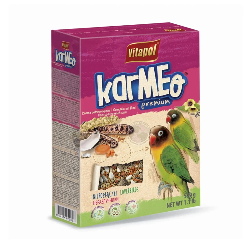 Main food for lovebirds KARMEO Premium 500 g. VITAPOL Complete food for lovebirds, containing all the necessary beneficial elements for a bird’s full life and good health. It includes grains, seeds, and fruits to nourish the body with vitamins and minerals. Thanks to the increased fiber content, digestion will improve. This food will help your pet develop properly, grow, and stay active and beautiful.