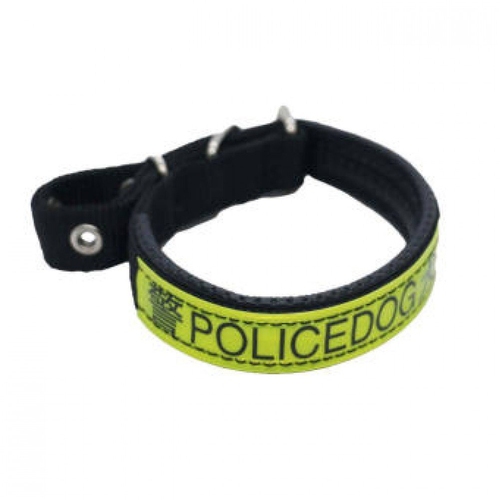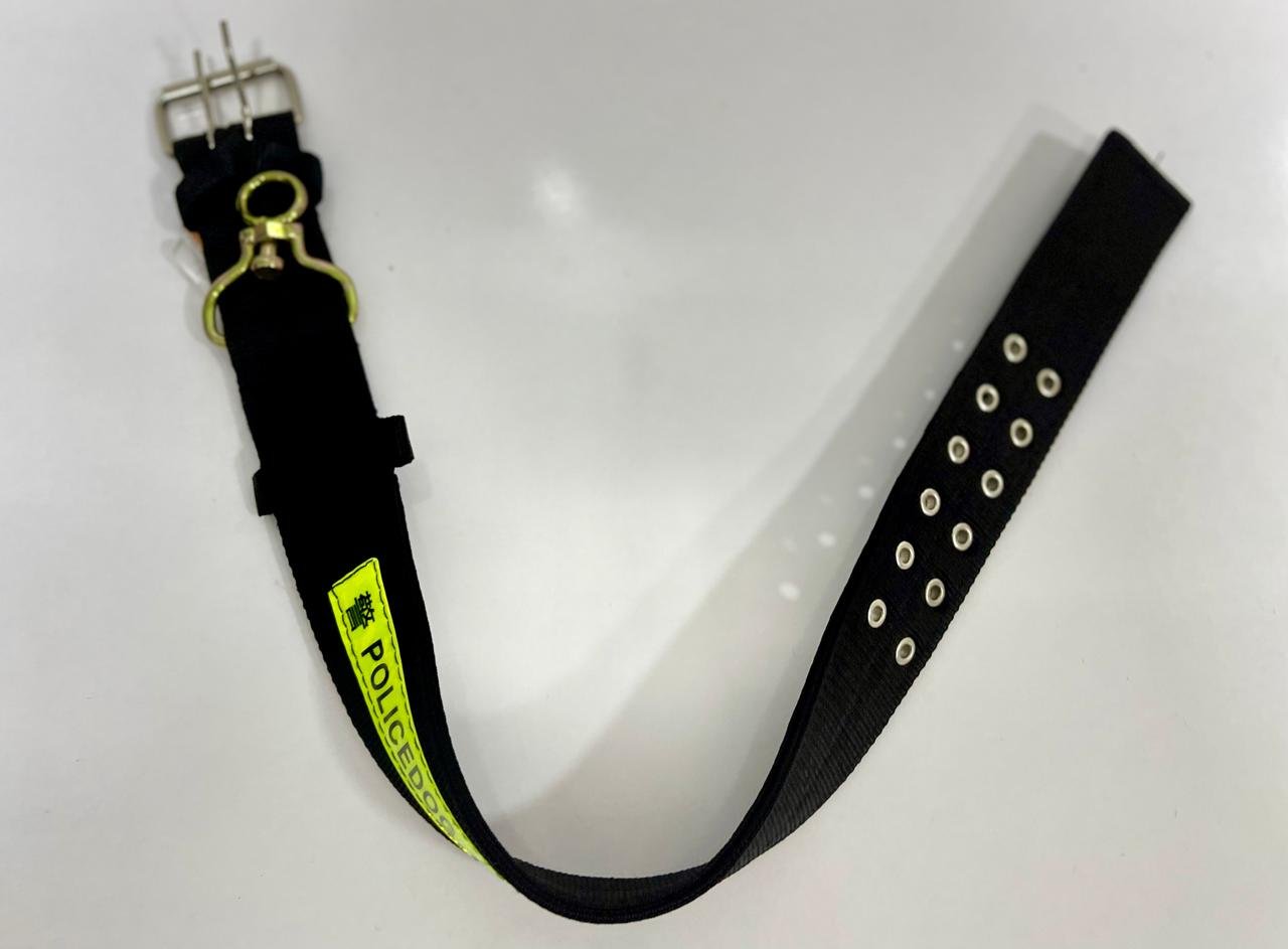 This is a small size neck belt suitable for small dogs. It is also known as patta belt. The belt has a police printed on it. It is light weight and stylish. There is rubber attached inside for pet comfort.